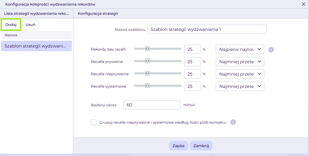 Po stworzeniu odpowiedniej strategii kliknij przycisk “Zapisz” aby utworzy nowy szablon strategii wydzwaniania rekordów. Administrator może utworzyć dowolną liczbę szablonów strategii kolejności wydzwaniania rekordów.