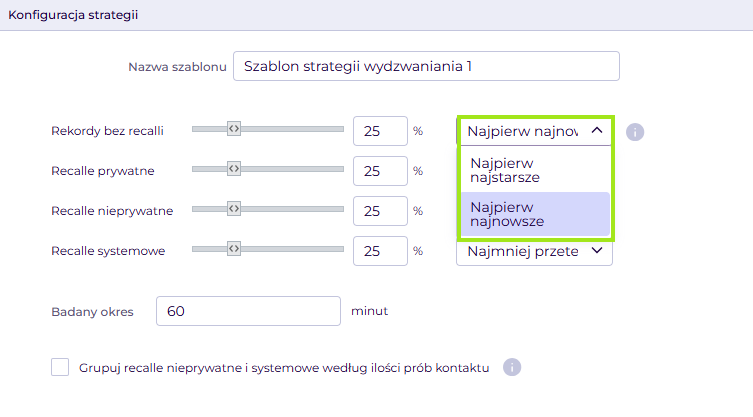 Dodatkowo przy każdym recallu można ustawić według jakiej strategii powinny być przydzielane recalle:
