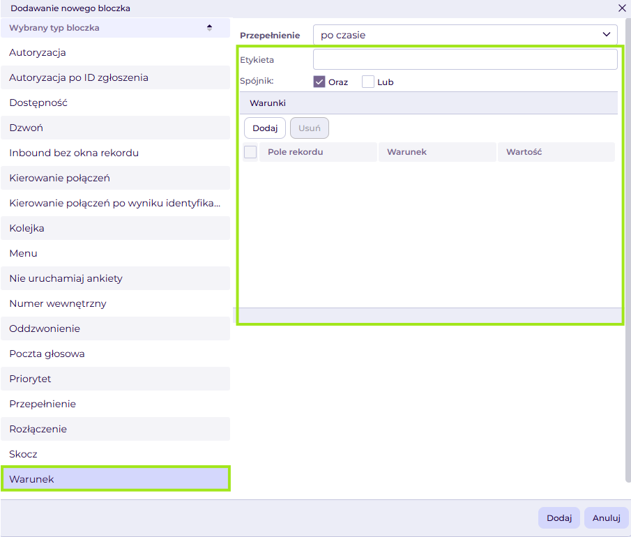 Warunek – jest to sekcja gdzie użytkownik dodaje bądź usuwa warunki, jakie muszą być spełnione aby dalej pokierować połączenie.
