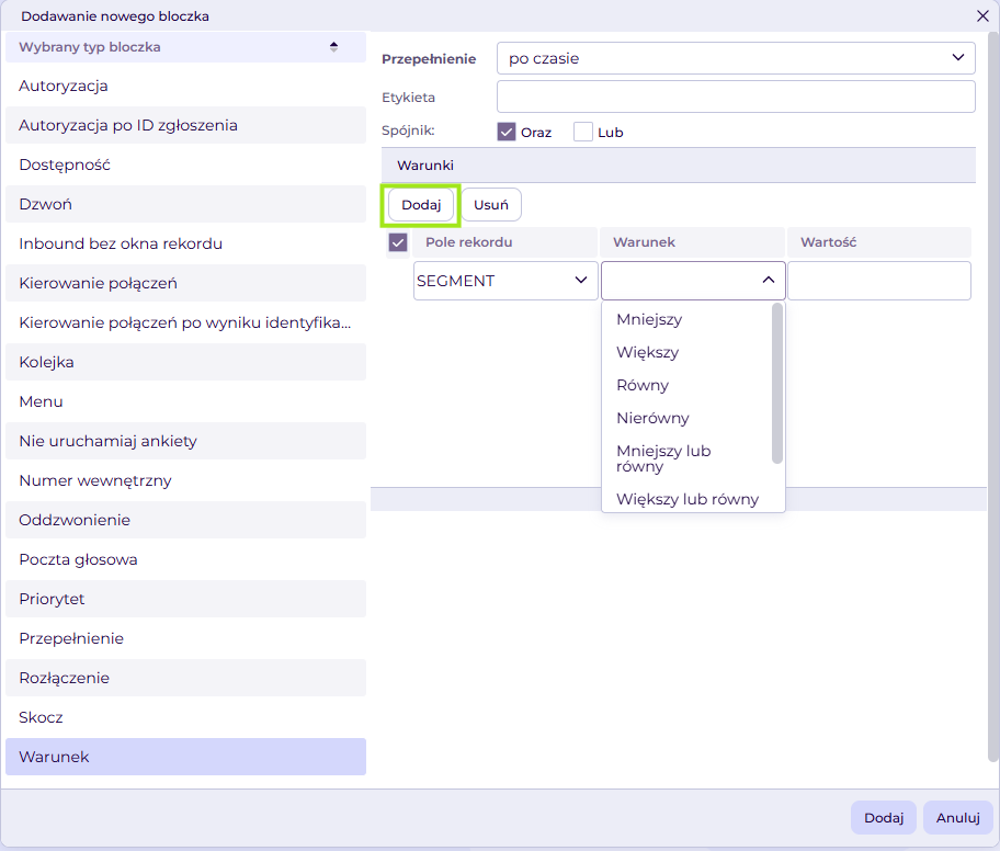 Po wprowadzeniu wszystkich warunków klikamy opcję „Dodaj” na dole okna dodawania bloczka.