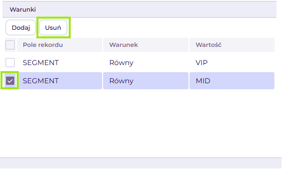 Rys. 3 – sekcja „Warunki” z zaznaczonym warunkiem do usunięcia wraz z zaznaczonym przyciskiem Usuń