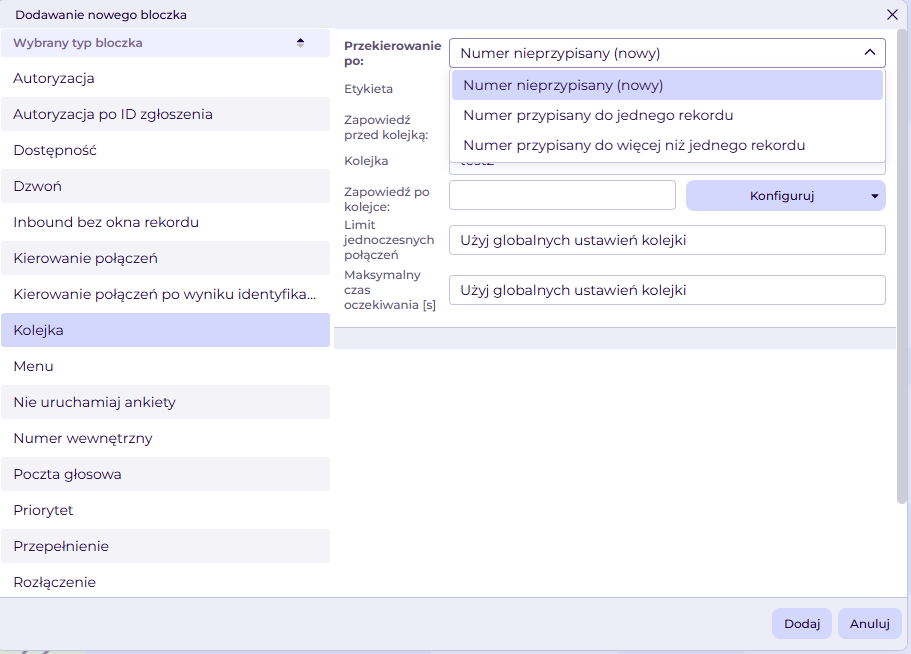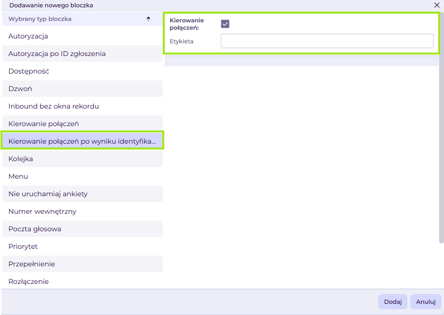 Rys. 1 - Okno dodawania nowego bloczka wraz z zaznaczoną opcją wyboru bloczka "Kierowanie połączeń po wyniku identyfikacji"