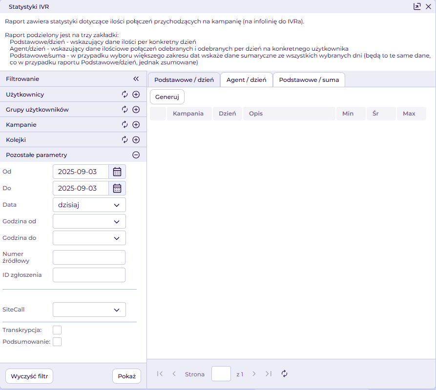 Raport Statystyki IVR umożliwia analizę połączeń przychodzących kierowanych do kampanii (infolinii). Dane prezentowane są zgodnie z ustawionymi filtrami i obejmują ruch obsługiwany przez IVR oraz kolejki.