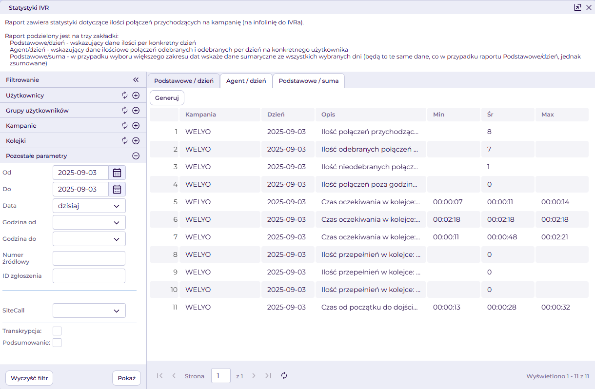 Widok prezentuje statystyki w podziale na agentów i dni.