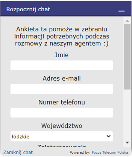 Ankieta przed rozpoczęciem czatu umożliwia uzyskanie informacji od klienta przed rozpoczęciem rozmowy. Dopiero po wprowadzeniu wymaganych danych będzie możliwość rozpoczęcia rozmowy.