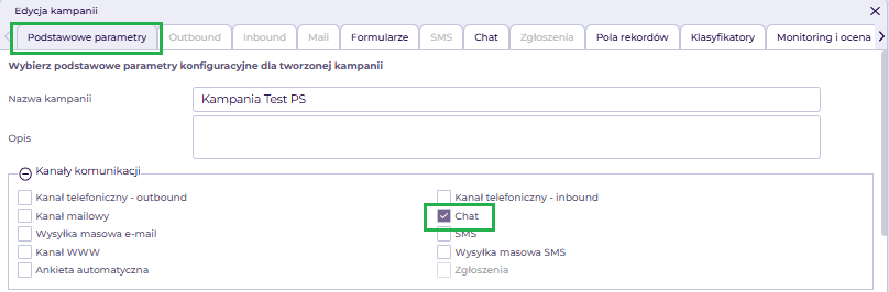 1. Konfiguracja ankiety możliwa będzie po aktywowaniu kanału czat w zakładce Podstawowe parametry. Pamiętaj, by w pierwszym kroku włączyć kanał czatowy. 😊