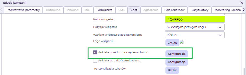 Następnie zaznaczamy checkbox przy ankiecie przed rozpoczęciem czatu i klikamy przycisk konfiguracja. Otworzy się okno, w którym dodajemy zawartość ankiety.
