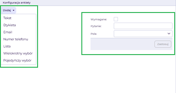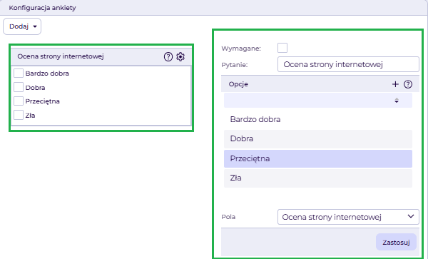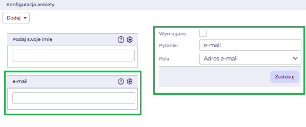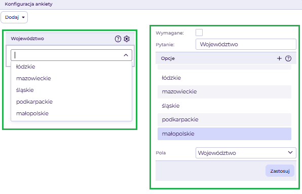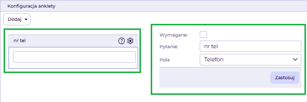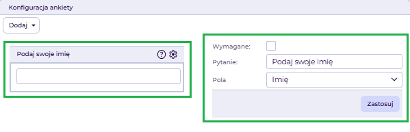 Podobnie jak w przypadku pola tekstowego wprowadzamy treść pytania, wybieramy pole rekordu i decydujemy, czy pole ma być wymagane. Po wprowadzeniu zmian klikamy zastosuj.