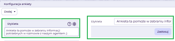 W okienku etykieta wprowadzamy tekst, który ma być widoczny w ankiecie. W tym przypadku klient nie będzie miał możliwości odpowiedzi. Po wprowadzeniu zmian klikamy zastosuj.