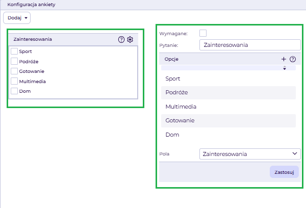 Podobnie jak w przypadku listy oznaczamy, czy pole ma być wymagane, wprowadzamy treść pytania i dodajemy odpowiedzi, które klient ma mieć do wyboru. Klient będzie mógł wybrać kilka odpowiedzi z listy.