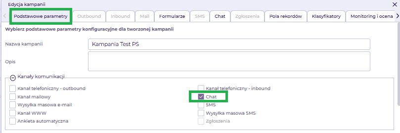 Konfiguracja ankiety możliwa będzie po aktywowaniu kanału czat w zakładce Podstawowe parametry. Pamiętaj, by w pierwszym kroku włączyć kanał czatowy. 😊