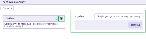 W okienku etykieta wprowadzamy tekst, który ma być widoczny w ankiecie. W tym przypadku klient nie będzie miał możliwości odpowiedzi. Po wprowadzeniu zmian klikamy zastosuj.