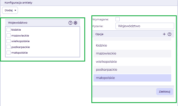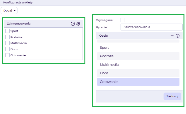 Podobnie jak w przypadku listy oznaczamy, czy pole ma być wymagane, wprowadzamy treść pytania i dodajemy odpowiedzi, które klient ma mieć do wyboru. Klient będzie mógł wybrać kilka odpowiedzi z listy. Po wprowadzeniu zmian klikamy zastosuj.