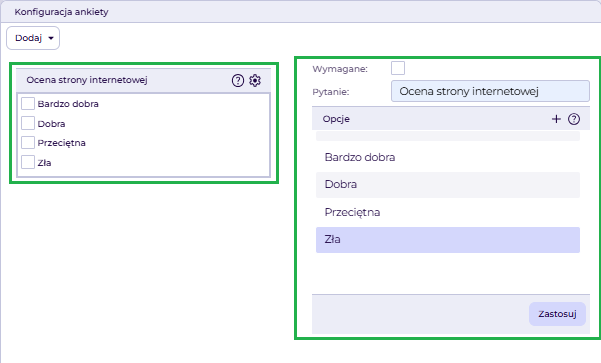 Podobnie jak w przypadku pola tekstowego wprowadzamy treść pytania i decydujemy, czy pole ma być wymagane. Po wprowadzeniu zmian klikamy zastosuj.