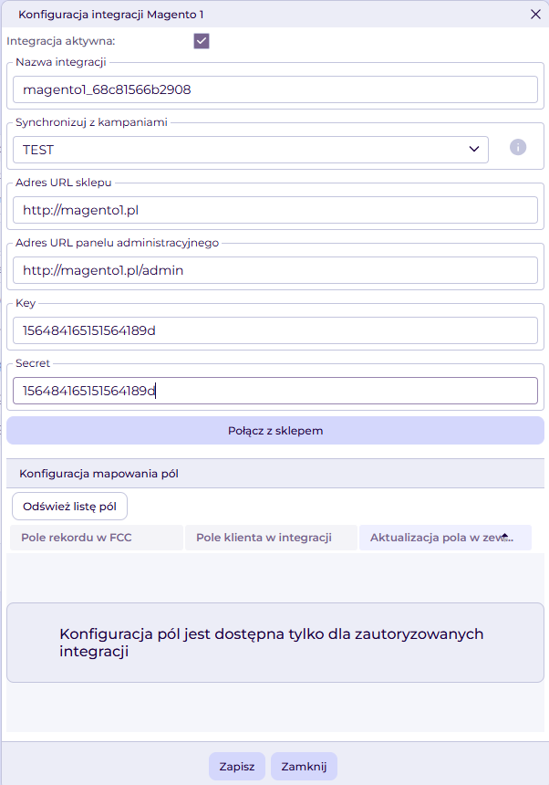 Na samym początku zaznaczamy checkbox Integracja aktywna.
