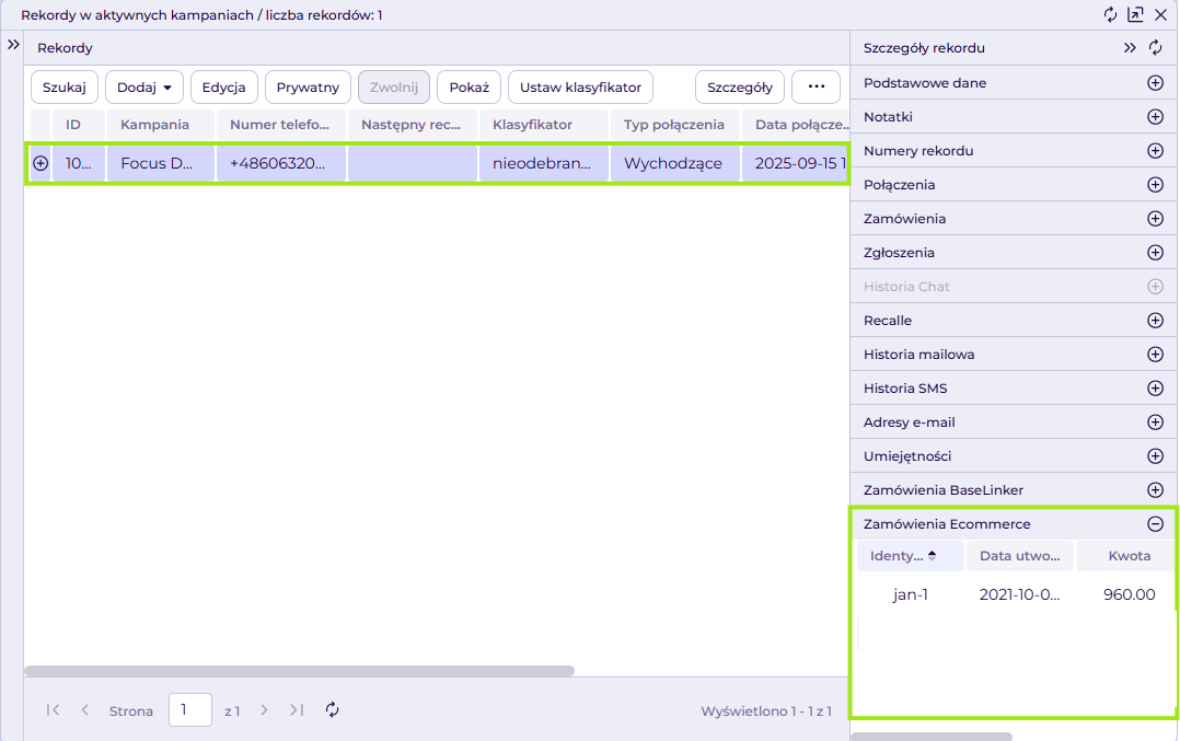 Po zaznaczeniu rekordu przechodzimy do zakładki szczegóły rekordu i rozwijamy pasek zamówienia ecommerce.