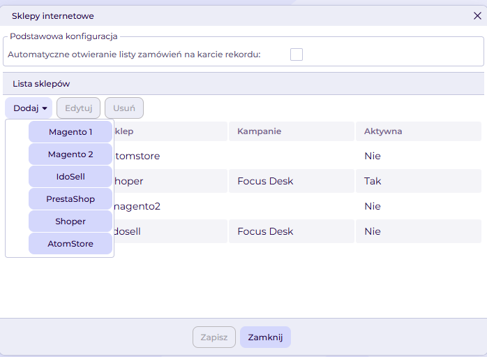 Otworzy się okno, w którym dodajemy integracje. Klikamy na Dodaj i wybieramy z listy konkretny sklep. .