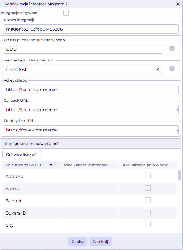 Na samym początku zaznaczamy checkbox Integracja aktywna.