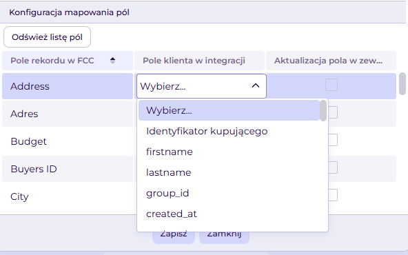 W oknie edycji integracji na liście w konfiguracji mapowania pól (kolumna pola rekordów w Welyo) widoczne będą wszystkie pola rekordów, które dodane zostały w Welyo (najpierw pola rekordów muszą zostać dodane w kampanii). . Samo mapowanie wykonujemy ręcznie, klikając na wybrane pole z integracji w kolumnie pole klienta w integracji. Pojawi się wtedy lista pól, z której wybieramy jedno konkretne do połączenia.