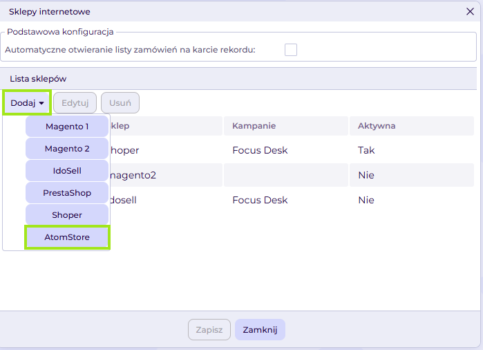 Jeżeli klikniemy w pole z adresem sklepu, zamówienie otworzy się w systemie AtomStore.