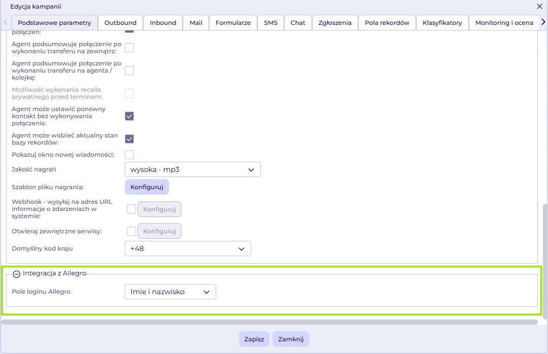 Na dole okna w podstawowych parametrach wybieramy pole rekordu, w którym ma się zapisywać login Allegro.