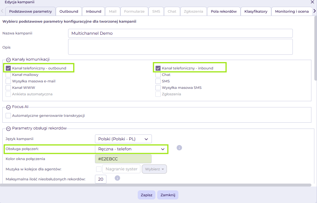 W zakładce Podstawowe parametry należy pamiętać o wprowadzeniu kanałów Inbound i Outbound oraz ręcznej obsługi połączeń.