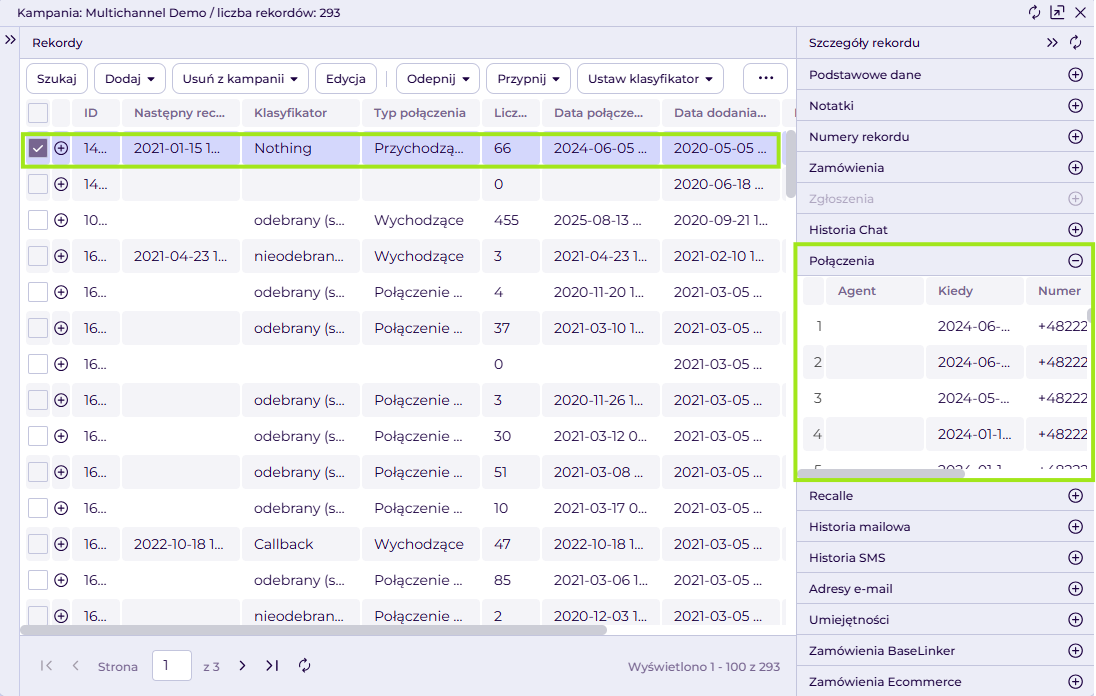 W platformie Welyo historia połączeń widoczna będzie na rekordzie w podglądzie kampanii (ścieżka: Kampanie > Kampanie > zaznaczamy kampanię > Podgląd > zaznaczamy rekord > Połączenia).