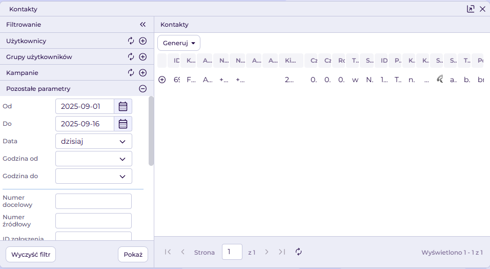 Historia wszystkich połączeń dostępna też będzie w raporcie kontakty (ścieżka: Raportowanie > Kontakty > Kontakty).