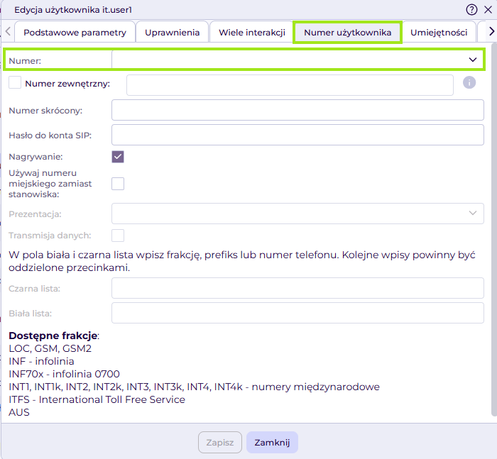 - Użytkownik musi mieć dodany numer miejski (ścieżka: Personel > Użytkownicy > Dodaj/Edytuj > Numer użytkownika > numer). Numer wybieramy z rozwijanej listy