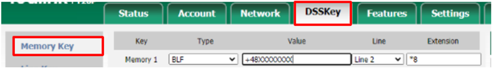 W następnym kroku konieczna jest odpowiednia konfiguracja telefonu Yealink. Po zalogowaniu do telefonu przechodzimy do zakładki DSSKey > Memory Key.