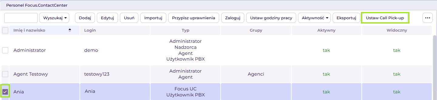 Otworzy się okno z listą użytkowników. Po zaznaczeniu użytkownika, którego połączenia mają być przechwytywane, klikamy Ustaw Call pick-up.