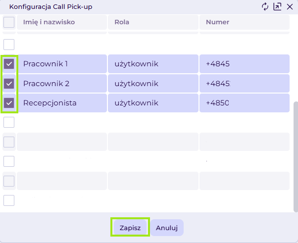 Następnie w oknie edycji wybieramy użytkowników, którzy będą mogli przechwytywać połączenia.