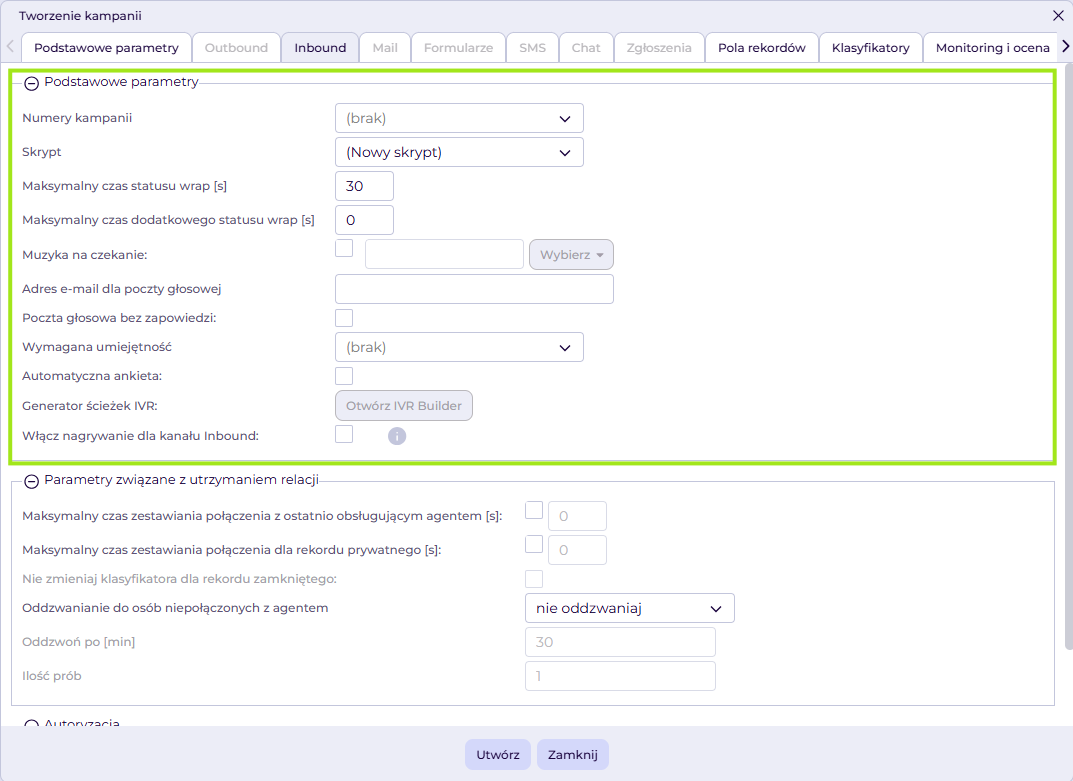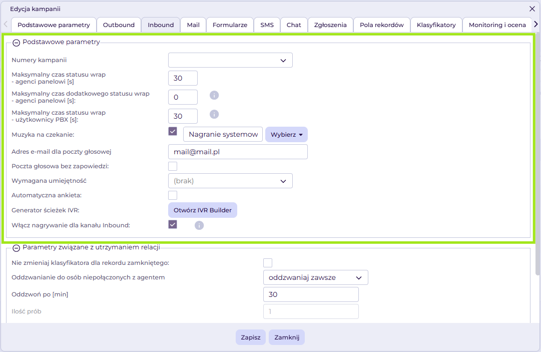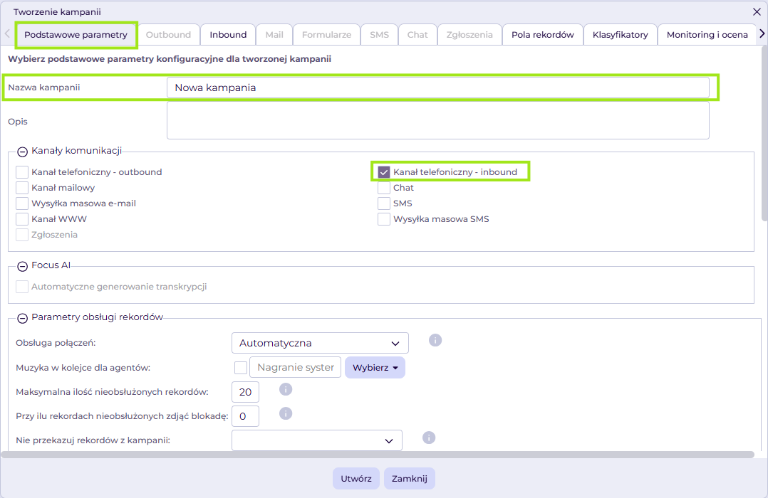 Zaczynamy od nadania nazwy kampanii i aktywowania kanału Inbound w zakładce Podstawowe parametry. Nazwa pozwoli Ci identyfikować kampanię na liście, a opcja kanał telefoniczny – inbound umożliwi konfigurację kanału połączeń przychodzących w kampanii