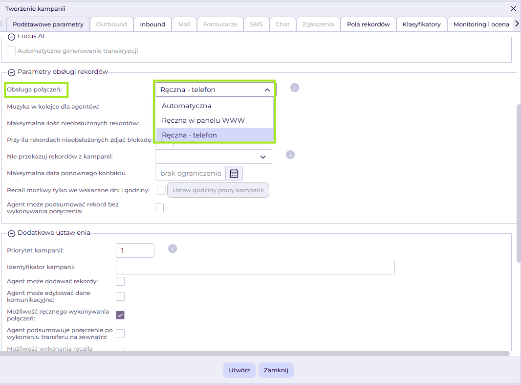- Obsługa połączeń – tutaj wybieramy sposób, w jaki połączenia będą odbierane i wykonywane w danej kampanii.