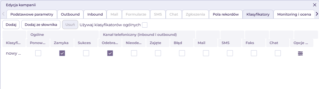 Nowy klasyfikator możemy utworzyć klikając przycisk Dodaj. Na końcu listy pojawi się nowy wiersz.