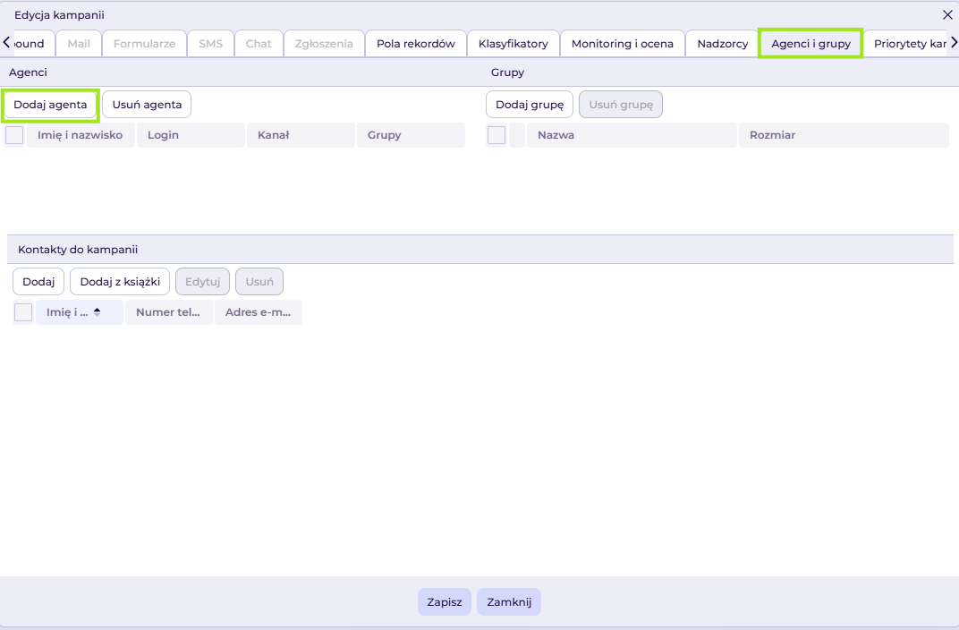 W tym miejscu dodajemy do kampanii agentów, którzy mają mieć możliwość wykonywania połączeń na rekordach (kanał outbound).