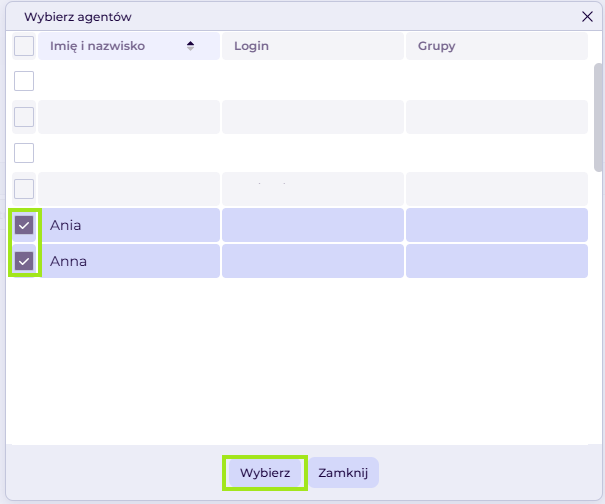 Zaznaczamy checkbox przy nazwie wybranego agenta i klikamy Wybierz.