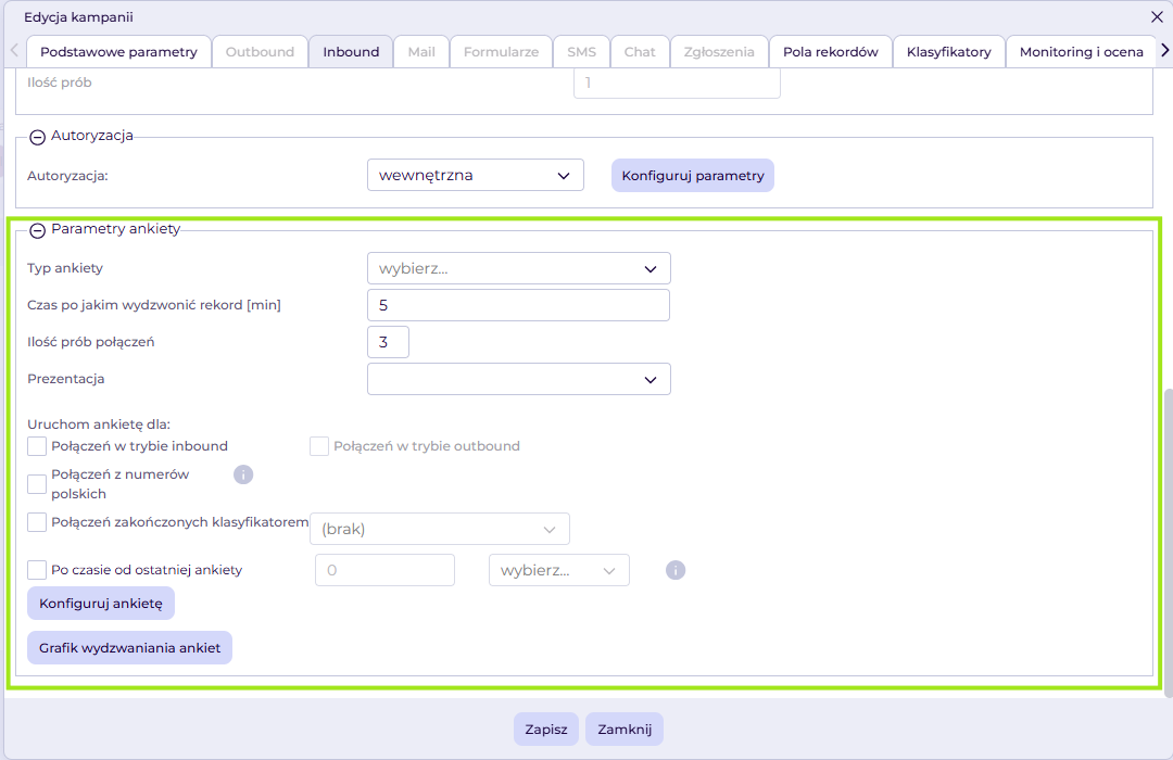 Automatyczna ankieta – funkcja ta umożliwia ustawienie ankiety; po zaznaczeniu checkboxa przechodzimy na dół okna, gdzie dostępne są dwa typy ankiety: