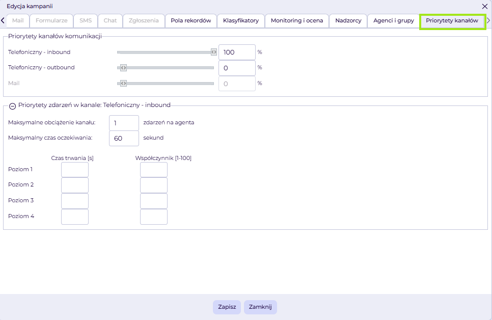 - Telefoniczny – outbound – ustalamy tu priorytet dla kanału wychodzącego.