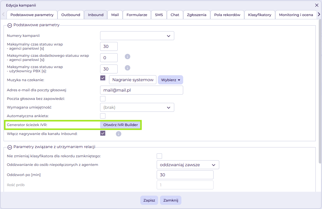 ! Pamiętaj, że dla tego typu okoliczności konieczne jest też włączenie uprawnień agent może podsumować rekord bez wykonywania połączenia (ścieżka: kampanie -> kampanie -> edytuj/dodaj -> podstawowe parametry).