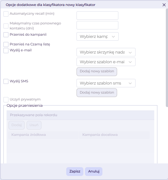 3. Przenieś do kampanii – możliwe jest przeniesienie rekordu po nadaniu klasyfikatora do innej kampanii; w opcjach dodatkowych definiujemy kampanie źródłową i docelową.
