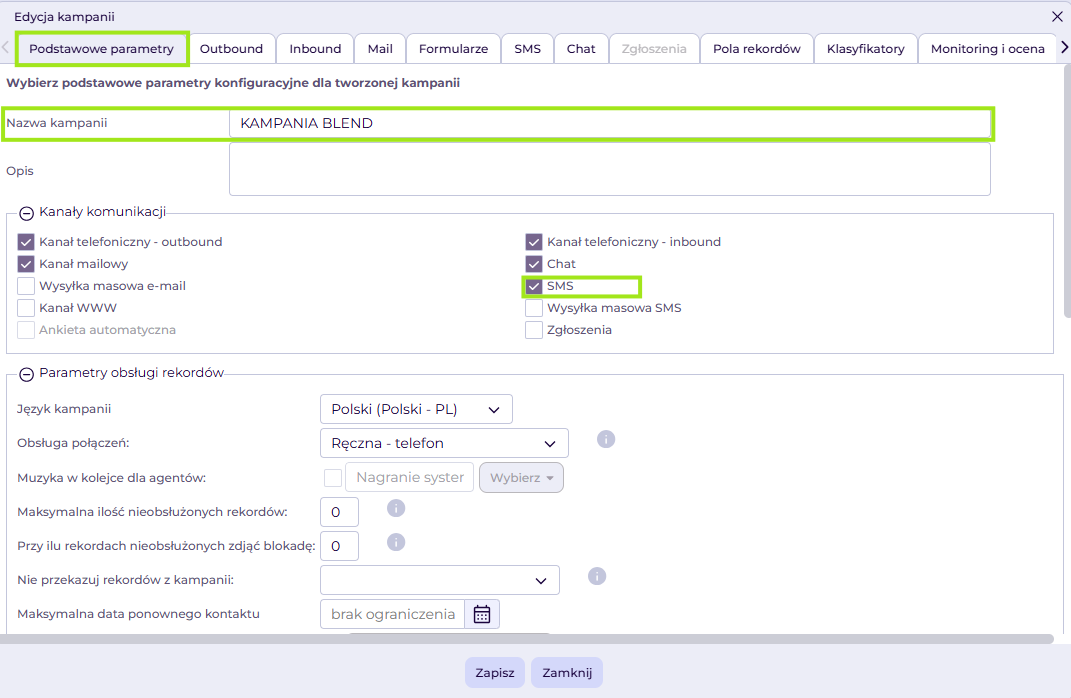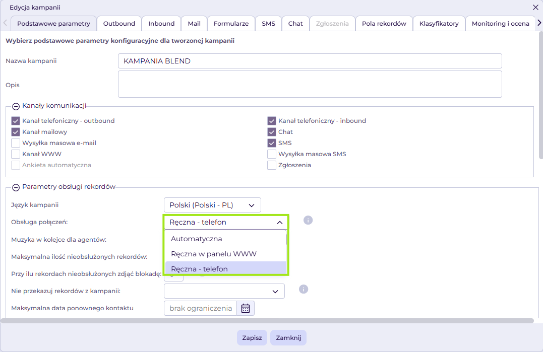 - Maksymalna ilość nieobsłużonych rekordów – określamy tu ile rekordów nieobsłużonych agent może mieć w swoim panelu; jeżeli wartość ta zostanie osiągnięta, nie będzie można otworzyć żadnego kolejnego rekordu, konieczne będzie obsłużenie tych, które nie zostały wcześniej obsłużone.