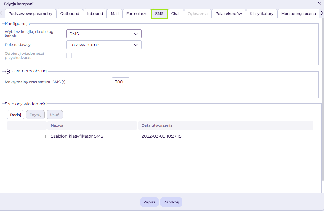 - Maksymalny czas statusu SMS [s] –parametr ten określa, ile czasu agent będzie miał na obsłużenie wiadomości SMS (jest to czas WRAP dla SMS-a). Czas w tym miejscu określany jest w sekundach. Po upłynięciu określonego czasu rekord trafi na listę nieobsłużonych.