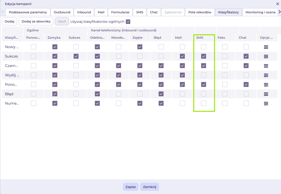 Jeżeli dla powyższych typów połączeń/kontaktów ma być dostępny określony klasyfikator, w danej kolumnie zaznaczamy checkbox.