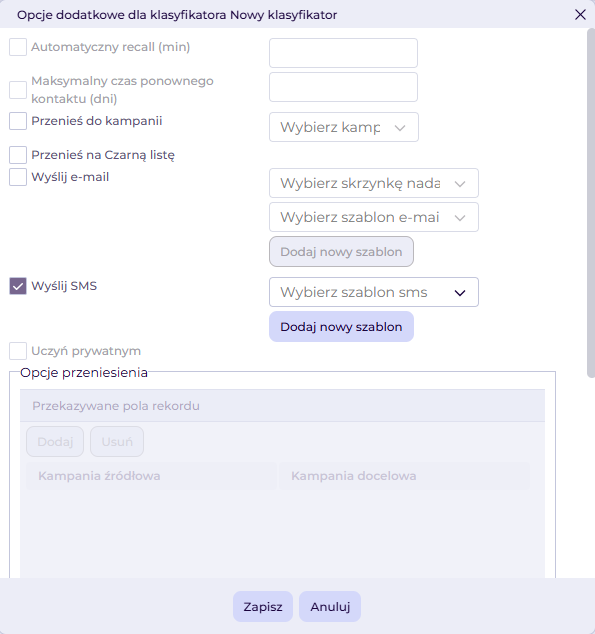 - Ponowny kontakt – zaznaczenie tej opcji spowoduje ustawienie recalla dla rekordu, na którym nadany zostanie ten klasyfikator.