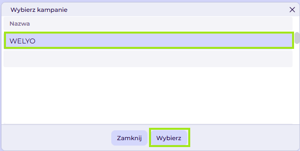 W pierwszym kroku wybieramy kampanię, dla której chcemy wygenerować raport, a następnie klikamy Wybierz.