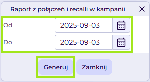 Raport Połączenia + Recalle zawiera informacje o wykonanych aktywnościach na rekordach (połączeniach oraz innych kontaktach) wraz z danymi o ustawionych recallach. Raport można wygenerować i pobrać w formacie XLSX.