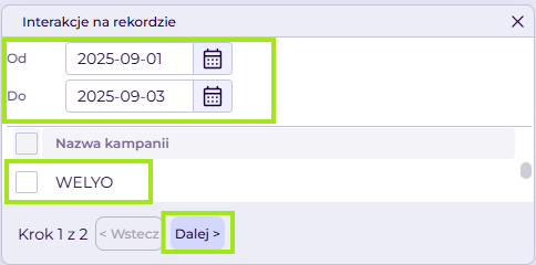 - Wybieramy zakres dat oraz kampanie i klikamy Dalej.