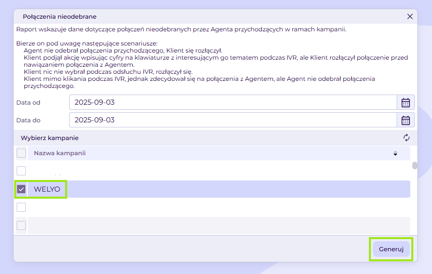 Raport przedstawia połączenia przychodzące w ramach kampanii, które nie zostały odebrane przez Agenta. Uwzględnia zarówno sytuacje, w których klient rozłączył się w IVR, jak i przypadki, gdy połączenie nie zostało odebrane przez Agenta.