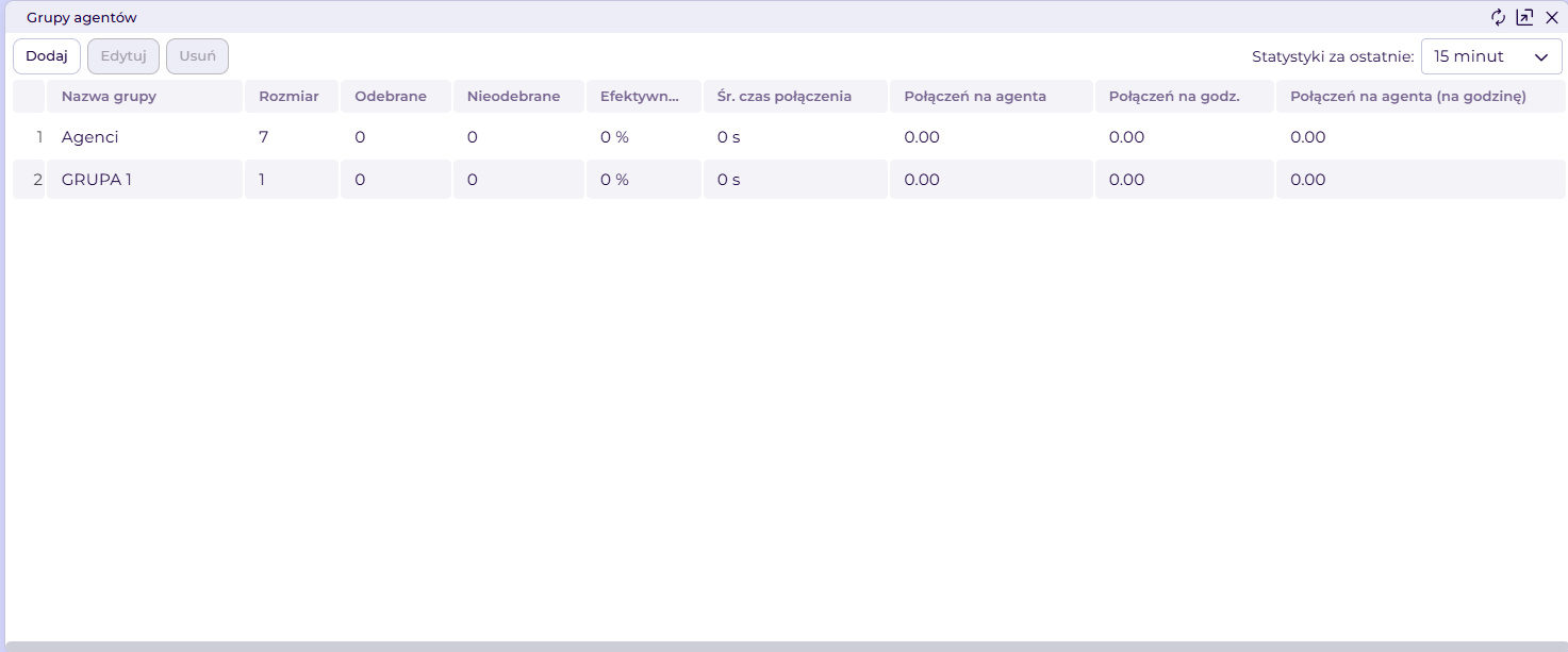 Funkcjonalność umożliwia podgląd agentów przypisanych do grupy w czasie rzeczywistym. Agenta można usunąć z grupy poprzez zaznaczenie i wybranie przycisku Usuń.